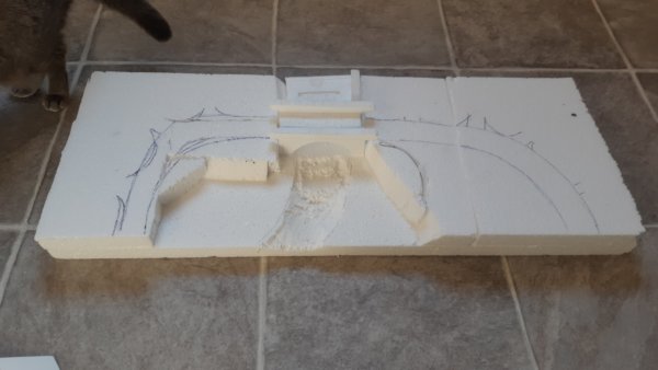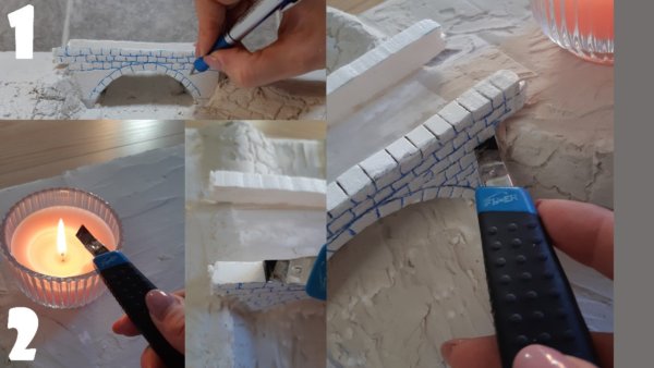 Híd tégláit, egy elég érdekes módszerrel alakítottam ki. Sniccer élét megmelegítettem láng felett és olvasztottam a hungarocellt a megrajzolt vonalak mentén. (Nem kell túl mélyre nyomni a pengét.)