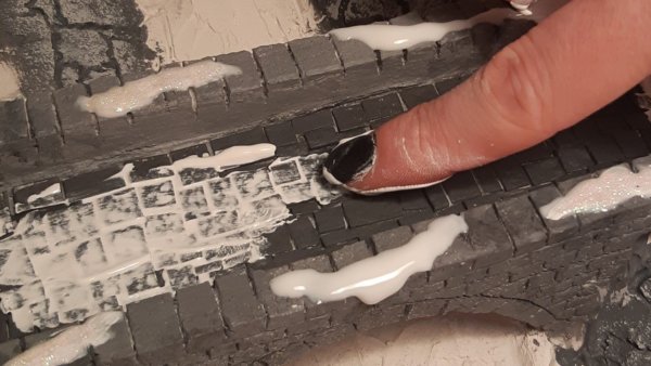 Modellező pasztával lekentem az ujjaimmal, hogy a réseket kitöltse és a kis lapok felülete is kap egy kopottas hatást. (Ha túl fehérnek találtam, egy nedves törlőkendővel leszedtem egy minimális fehér pasztát)